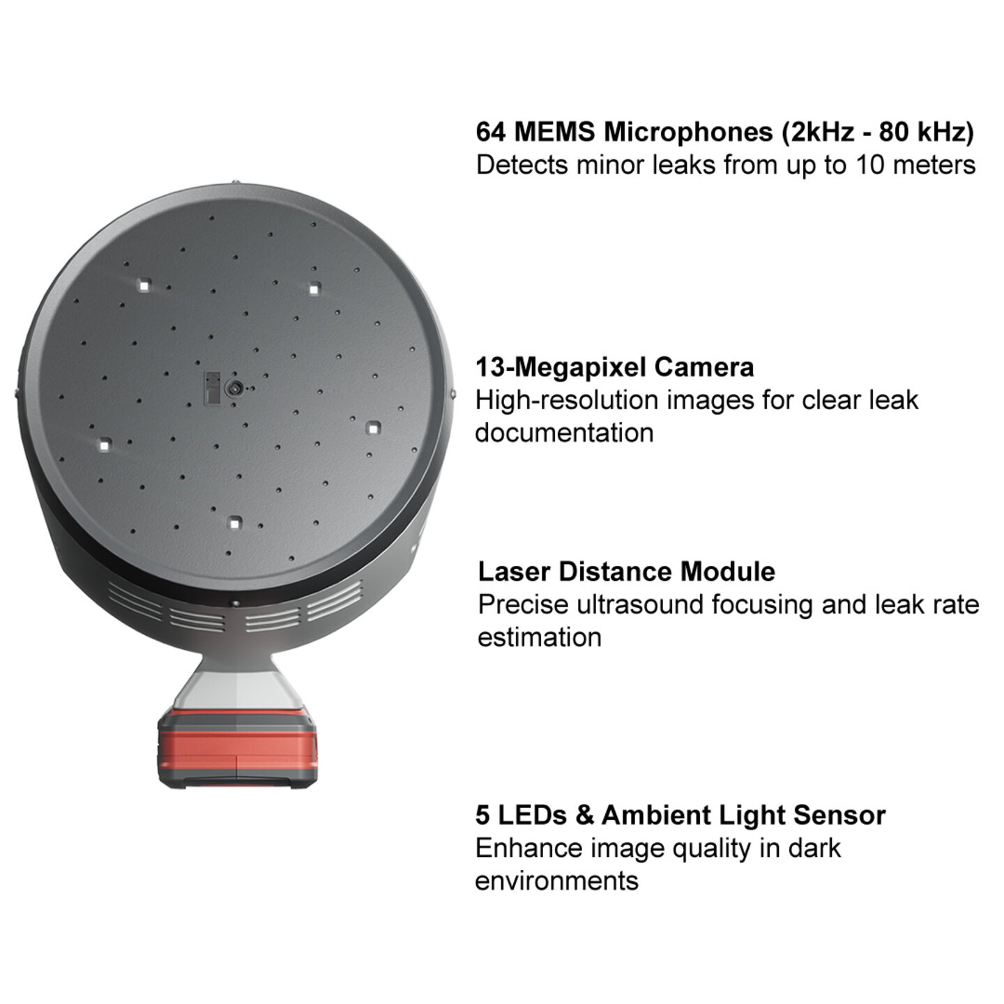 Grâce à ses 64 microphones ultrasoniques, la LeakCam 600 détecteur de fuite utilise la technologie Power Beamforming pour capter et analyser simultanément plusieurs sources de fuite. Cette approche garantit une localisation fiable jusqu’à 10 mètres, sans interférence entre fuites de différentes intensités.